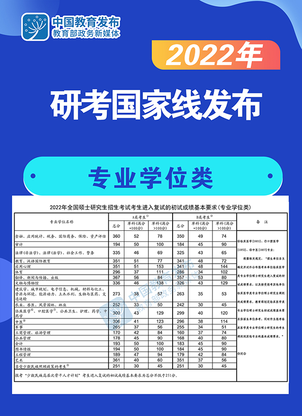 同日,教育部發(fā)布了《2022年全國碩士研究生招生考試考生進入復試的初試成績基本要求》(國家分數(shù)線)。各招生單位將根據(jù)《2022年全國碩士研究生招生工作管理規(guī)定》,在國家分數(shù)線的基礎(chǔ)上,自主確定并公布本單位各專業(yè)考生進入復試的要求。