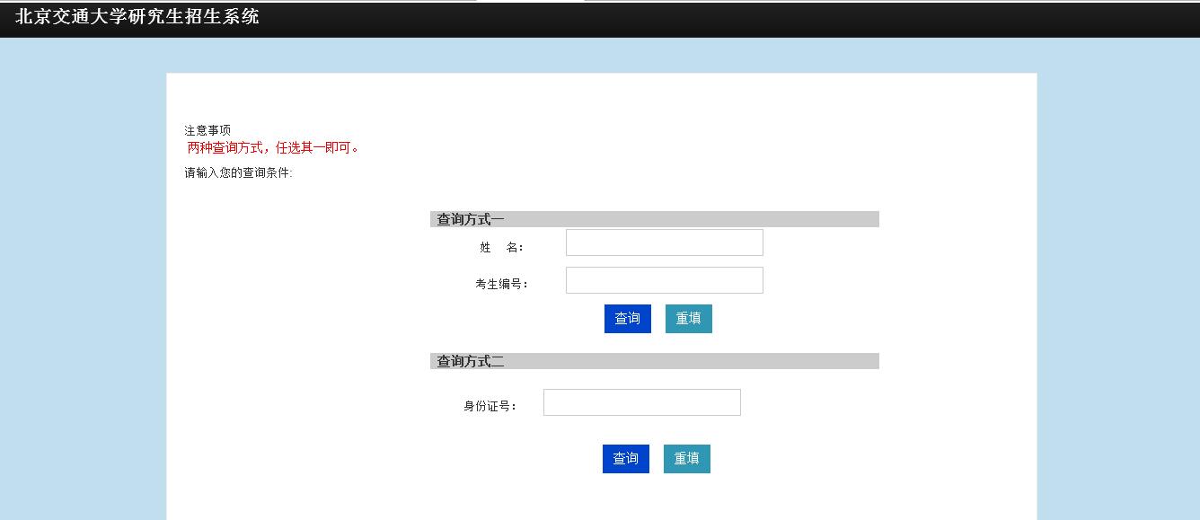 1.我校2016年碩士生入學(xué)考試初試成績(jī)于2月16日上網(wǎng)公布。考生憑姓名和考生編號(hào)(見(jiàn)準(zhǔn)考證)或者身份證號(hào)登錄北京交通大學(xué)研究生院,進(jìn)入“北京交通大學(xué)研究生院招生專題”,在“碩士入學(xué)成績(jī)”中查詢本人初試成績(jī)。