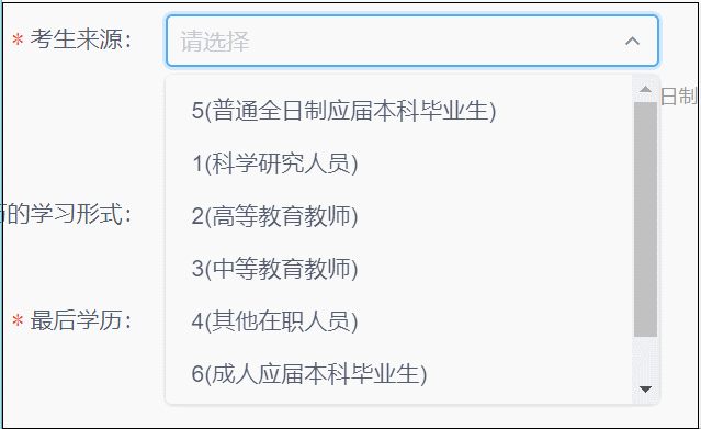 問的最多的就是往屆生,記住,今年7月份以前畢業(yè)的就算是往屆生,不要選5(普通全日制應(yīng)屆本科生),按照自己的身份,選擇相應(yīng)的:科研人員、高等教育教師、中等教育教師、其他在職人員、成人應(yīng)屆本科畢業(yè)生、其他人員。大多數(shù)往屆生沒有工作全職備考,那么就選7(其他人員),如果有工作,就選4(其他在職人員)。目前還在讀的本科生,考生來源選擇5(普通全日制應(yīng)屆本科畢業(yè)生)。