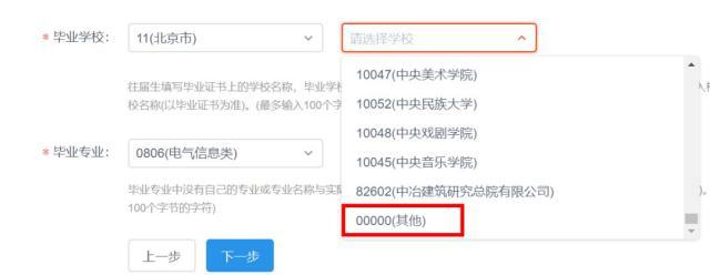 在選擇學(xué)校下拉框下面,拉到最下面選擇最后一項(xiàng)0000(其他),然后手動(dòng)輸入學(xué)校名稱。