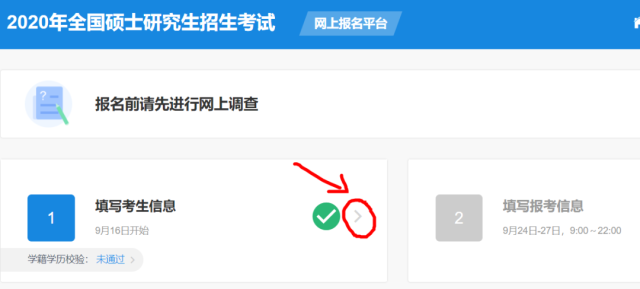 首先,考研報(bào)名分為兩步,第一步:填考生信息(從9月16號(hào)就開放一直持續(xù)到10月31號(hào)都可以修改填寫);第二步:填寫報(bào)考信息(只在預(yù)報(bào)名和正式報(bào)名期間開放可填寫) ;