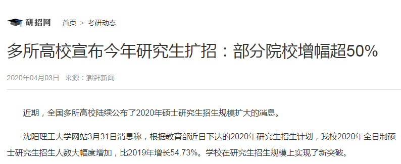 就在這樣不景氣的階段里,研招網發(fā)布了研究生擴招近50%的消息打破了大學生和在職人員的焦慮,讓很多迷茫的看到了機會。