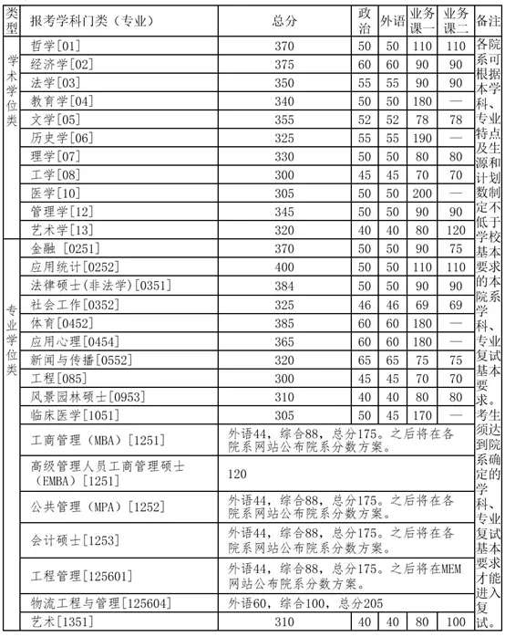 (2)“少數(shù)民族高層次骨干人才計(jì)劃”(不含新疆MPA項(xiàng)目):同時(shí)滿(mǎn)足滿(mǎn)分100分科目單科成績(jī)不低于40分;滿(mǎn)分150分科目單科成績(jī)不低于70分;滿(mǎn)分200分科目單科成績(jī)不低于107分;滿(mǎn)分300分科目單科成績(jī)不低于140分;總分滿(mǎn)分300分考生總分不低于195分;總分滿(mǎn)分500分考生中,理工醫(yī)考生(報(bào)考專(zhuān)業(yè)代碼前兩位為“07”、“08”或“10”)要求總分不低于270分,非理工醫(yī)考生總分不低于320分?;蛘咭罁?jù)所報(bào)考院系(專(zhuān)業(yè))復(fù)試分?jǐn)?shù)線,總分線降10分,單科線不降。兩項(xiàng)分?jǐn)?shù)政策不可同時(shí)享受。