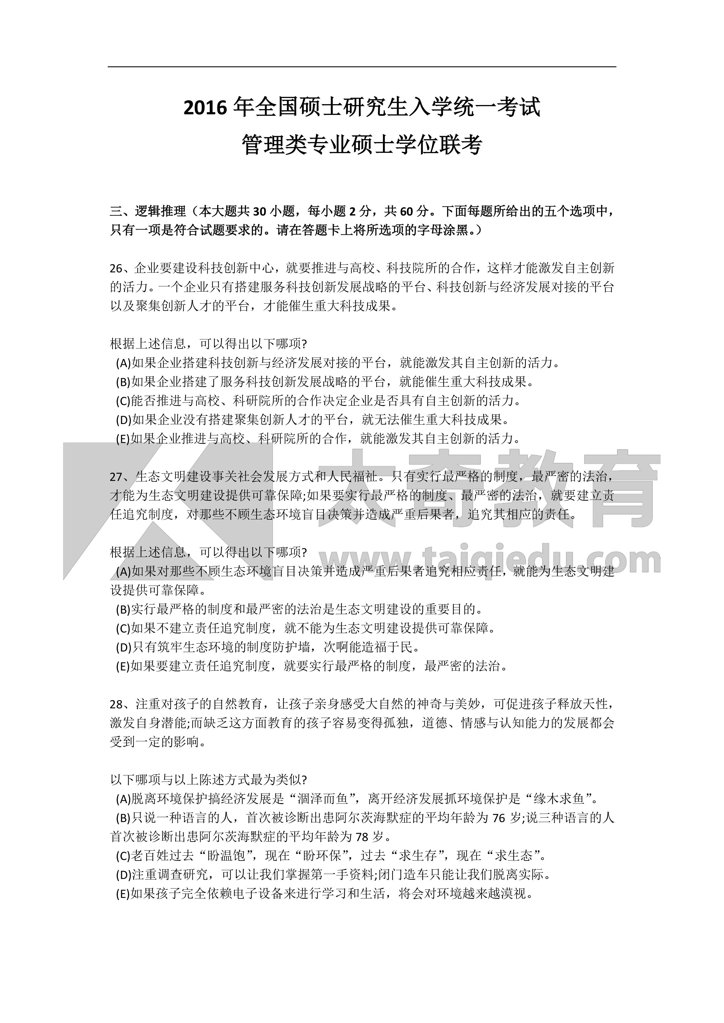 管理類碩士官方備考群,考生互動(dòng),擇校評(píng)估,真題討論 點(diǎn)擊加入備考群>>2016年全國碩士研究生招生入學(xué)考試初試將于(12月26日上午8:30-11:30,下午14:00-17:00)開考,全部統(tǒng)考科目實(shí)行網(wǎng)上評(píng)卷。太奇MBA官網(wǎng)將第一時(shí)間搶先發(fā)布2016年管理類聯(lián)考各科目真題解析答案、解析,請(qǐng)考生及時(shí)關(guān)注太奇MBA官網(wǎng)真題解析專題,第一時(shí)間獲悉最新MBA考研訊息。