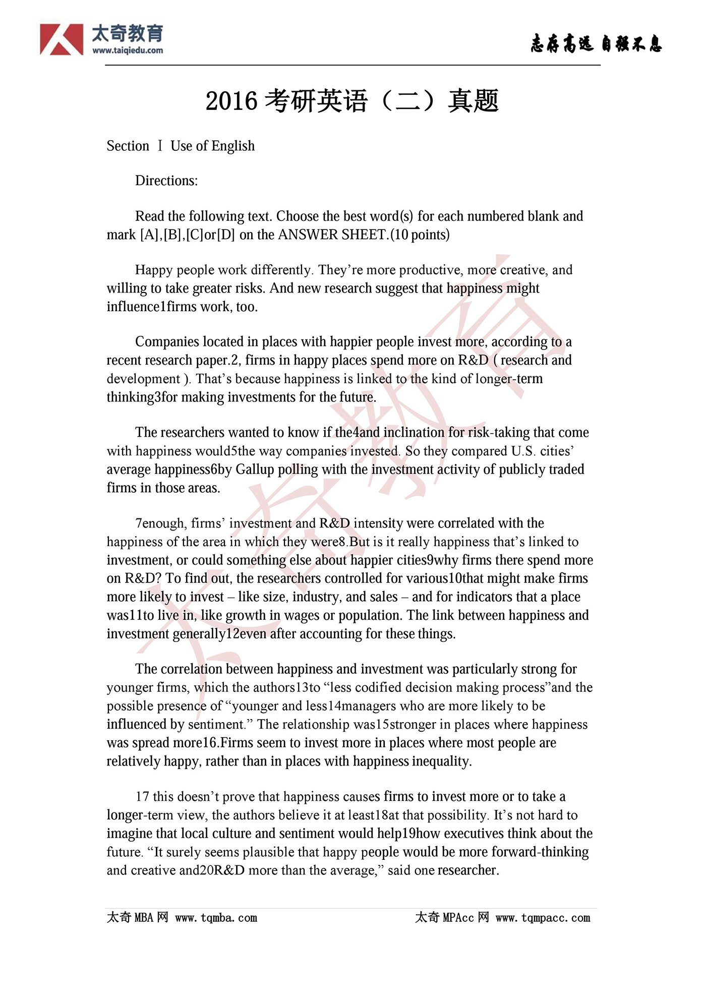 2016MBA管理類(lèi)聯(lián)考英語(yǔ)(二)真題完整版