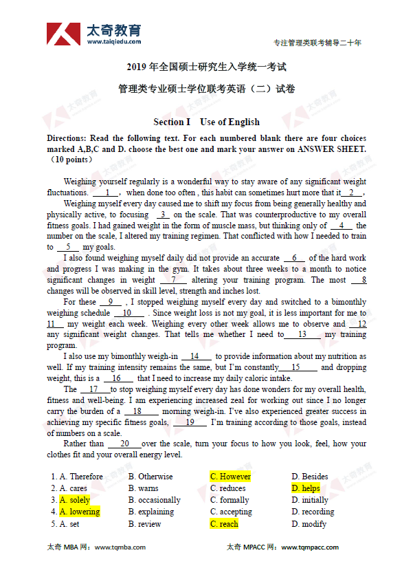 2019年管理類聯(lián)考MBA英語二真題及參考答案