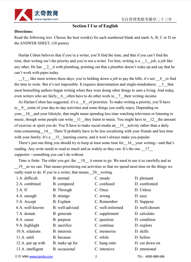 今天太奇小編為大家整理了2022年考研英語(二)真題,考試答案在文章最后,祝大家今年考試順利,考上自己心儀的院校。