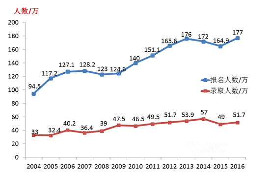 2016年我國(guó)碩士研究生報(bào)名人數(shù)約為177萬(wàn)人,比2015年增長(zhǎng)約12萬(wàn)人,增長(zhǎng)約7%,打破了自2014年以來(lái)的考研人數(shù)兩連降趨勢(shì)。同時(shí),2016年全國(guó)研究生招生計(jì)劃總?cè)藬?shù)為51.72萬(wàn)人,錄取比例約為29%。2004年至2016年全國(guó)考研報(bào)名人數(shù)及錄取人數(shù)詳情見(jiàn)下圖。