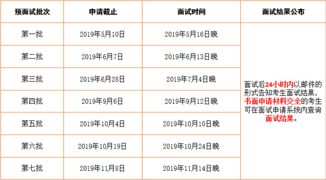 面試安排批次依照考生遞交書面材料的順序先到者先評估,先安排預(yù)面試。預(yù)面試內(nèi)容:綜合能力面試(個面)、英語能力測試(6到8人一組面試)。面試后我校會在系統(tǒng)中告知考生的面試成績,即錄取分?jǐn)?shù)線類別(A線B線C線)。報考我校一志愿的考生成績兩年有效,次年可繼續(xù)申請。