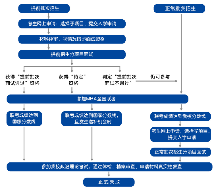4.“MBA提前批次招生”將安排于2020年6月至10月進(jìn)行,參加提前批次招生的考生需在聯(lián)考報(bào)名前的指定期間內(nèi)在線提交申請(qǐng)材料,經(jīng)過(guò)材料評(píng)審,擇優(yōu)給予面試資格;經(jīng)過(guò)面試環(huán)節(jié)擇優(yōu)給予綜合素質(zhì)優(yōu)秀的考生“提前批次面試通過(guò)”資格;原則上,該類考生參加全國(guó)聯(lián)考成績(jī)達(dá)到國(guó)家線、符合復(fù)試要求即可附條件錄取。(以當(dāng)年國(guó)家政策和學(xué)校要求為準(zhǔn))