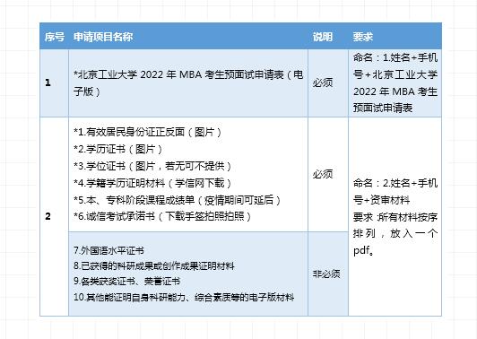 2.申請(qǐng)材料:請(qǐng)將《北京工業(yè)大學(xué)2022年MBA考生預(yù)面試申請(qǐng)表》和資審材料放入同一文件夾(見原文鏈接附件),壓縮打包后發(fā)送,郵件名稱和文件夾名稱為“第x批2022MBA預(yù)面試+姓名+手機(jī)號(hào)”。