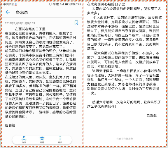 隨著太奇面試輔導不斷進行,同學們的參與感也愈發(fā)強烈,從最初清晰自己職業(yè)規(guī)劃,到后面的案例討論小組對抗、材料撰寫現(xiàn)場點評,再到最后的自我介紹現(xiàn)場驗收。182期所有參營面試學員一起認真活動,全力以赴的對待每一個環(huán)節(jié),不斷的突破學習、積累經驗和開闊視野。共享過程用心體會,有歡歌笑語也有智慧對沖,真實的做到突破自我追求卓越。