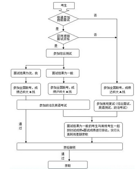 1.“提前面試”招生方式。采取“提前面試申請、背景評估、提前面試(綜合素質(zhì))、網(wǎng)上報(bào)名、現(xiàn)場確認(rèn)、全國聯(lián)考、復(fù)試(政治理論考試和英語面試)、正式錄取”的方式進(jìn)行。凡符合教育部規(guī)定的MBA報(bào)考條件的考生均可申請?zhí)崆芭嬖?,面試結(jié)果達(dá)到要求的考生享受相應(yīng)的專項(xiàng)政策。