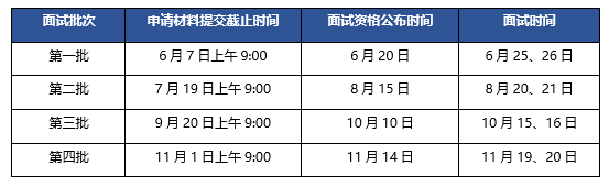 ②填寫和上傳申請材料。網(wǎng)上提交的申請材料包括:申請書、成績單、個人簡歷、單位組織結構圖、推薦信(非必需)。申請材料的具體內(nèi)容和要求見系統(tǒng)內(nèi)說明??忌峤簧暾埐牧蠒r需要選擇申請面試批次,并在所選批次申請材料提交截止日期前提交。各批次的申請截止時間和面試時間見下頁"面試批次"表。