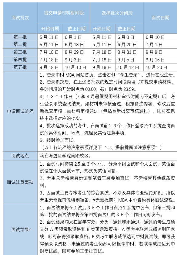 管理類碩士官方備考群,考生互動(dòng),擇校評(píng)估,真題討論 點(diǎn)擊加入備考群>>中央財(cái)經(jīng)大學(xué)MBA項(xiàng)目致力于培養(yǎng)具備全球視野和創(chuàng)新能力,擁有金融財(cái)務(wù)優(yōu)勢(shì),積極承擔(dān)社會(huì)責(zé)任的領(lǐng)導(dǎo)者。中央財(cái)經(jīng)大學(xué)MBA是國(guó)內(nèi)最具競(jìng)爭(zhēng)力和影響力的MBA項(xiàng)目之一,依托學(xué)校良好的社會(huì)聲譽(yù)和品牌價(jià)值,整合全校優(yōu)質(zhì)資源,注重發(fā)揮財(cái)經(jīng)學(xué)科特色和師資優(yōu)勢(shì),取得了豐碩的辦學(xué)成果和廣泛的社會(huì)認(rèn)可。2011年通過AMBA認(rèn)證,成為中國(guó)大陸地區(qū)第8家、北京地區(qū)首家AMBA認(rèn)證會(huì)員;2014年,通過AMBA再認(rèn)證,認(rèn)證有效期為5年;2017年,通過CAMEA認(rèn)證,認(rèn)證有效期為5年,并列第15位國(guó)內(nèi)高校通過認(rèn)證。同時(shí),中央財(cái)經(jīng)大學(xué)MBA項(xiàng)目多年多次被新華網(wǎng)、央廣網(wǎng)、騰訊網(wǎng)、新浪網(wǎng)、中國(guó)網(wǎng)、世界經(jīng)理人等媒體評(píng)為品牌影響力MBA院校、創(chuàng)新力MBA項(xiàng)目、品牌知名度MBA院校、表現(xiàn)最佳MBA院校、最受雇主青睞MBA項(xiàng)目和綜合實(shí)力突出商科教育品牌等榮譽(yù)稱號(hào)。為選拔更多優(yōu)質(zhì)生源,同時(shí)也為考生增加自主選擇的機(jī)會(huì),我校擬在2019年仍然采取提前批面試和正常批面試相結(jié)合的原則,并且不提前設(shè)定提前批面試和正常批面試人數(shù)分布的固定比例。具體細(xì)則如下: