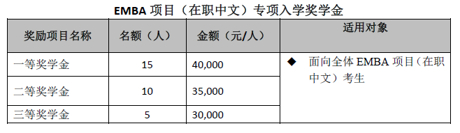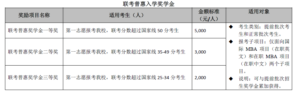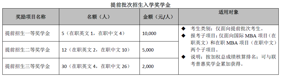 設立三種類別入學獎學金,以資鼓勵報考我校MBA項目、全國聯(lián)考初試分數(shù)成績優(yōu)秀、提前批次招生面試表現(xiàn)出色的考生。