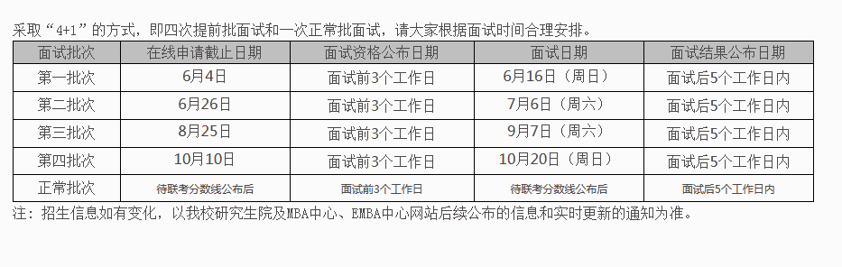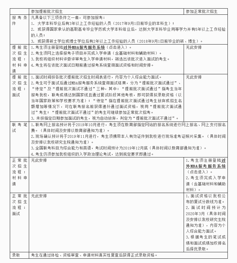 4. “MBA提前批次招生”將安排于2019年5月至10月進行,參加提前批次招生的考生需在聯(lián)考報名前的指定期間內(nèi)在線提交申請材料,經(jīng)過材料評審,擇優(yōu)給予面試資格;經(jīng)過面試環(huán)節(jié)擇優(yōu)給予綜合素質(zhì)優(yōu)秀的考生“提前批次面試通過”資格;原則上,該類考生參加全國聯(lián)考成績達到國家線、符合復試要求即可附條件錄取。(以當年國家政策和學校要求為準)