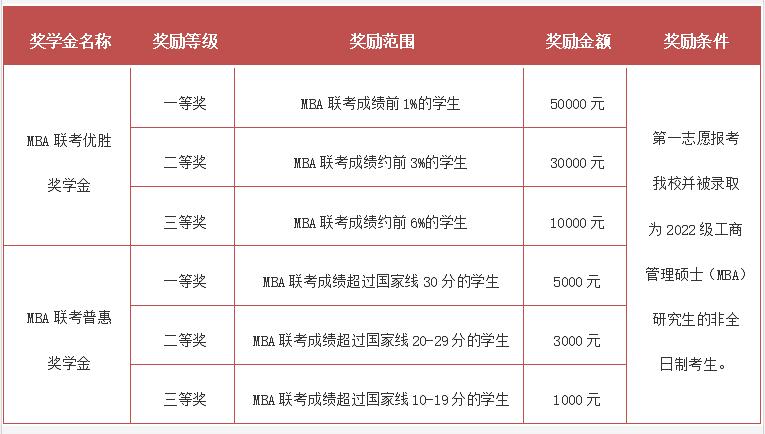 為了鼓勵優(yōu)秀人才攻讀非全日制工商管理碩士(MBA),培養(yǎng)更多品學(xué)兼優(yōu)的商界精英,北京交通大學(xué)MBA教育中心特設(shè)立MBA聯(lián)考優(yōu)勝獎學(xué)金、MBA聯(lián)考普惠獎學(xué)金。其獎勵范圍、獎金額度和獎勵對象如表二所示。2022級非全日制MBA新生獎學(xué)金評選辦法詳見后續(xù)通知。若有變動,均以具體通知為準。