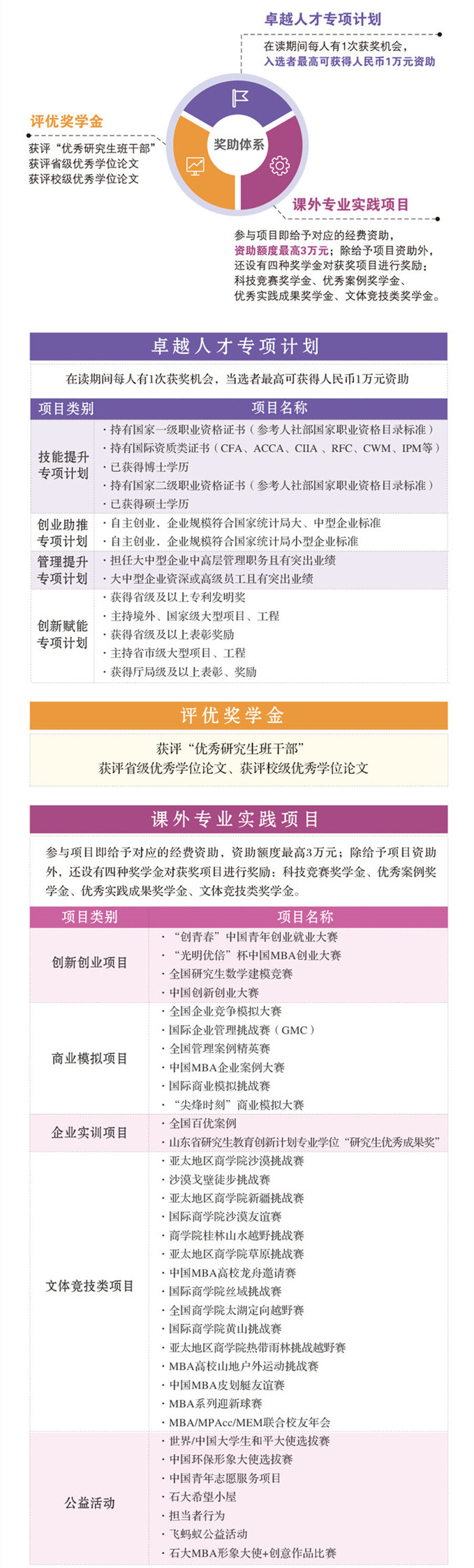 2015年學(xué)校MBA項(xiàng)目以優(yōu)良的成績通過教育部合格評估。2016年參加全國首次專業(yè)學(xué)位水平評估,在第八、九批100余所MBA培養(yǎng)高校中位居前列,在山東10所MBA培養(yǎng)高校中位列前三。2020年學(xué)院獲評“最具特色MBA項(xiàng)目”、“中國商學(xué)院卓越運(yùn)營獎”等。2021年MBA研究生陶付文榮獲全國五一勞動獎?wù)拢踯姇蠋熑脒x中國注冊會計師協(xié)會第二期會員培養(yǎng)(高端班)項(xiàng)目,是該期高端班35位注冊會計師會員中唯一一位來自高校的入選者。