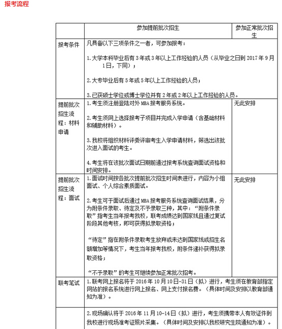 4. “MBA提前批次招生”將安排于2016年5月至11月進行,參加提前批次招生的考生需在聯(lián)考報名前的指定期間內(nèi)在線提交申請材料,經(jīng)過材料評審,擇優(yōu)給予面試資格;經(jīng)過面試給予綜合素質(zhì)優(yōu)秀的考生“附條件錄取”資格;原則上,該類考生參加全國聯(lián)考成績達到國家A線即可錄取。