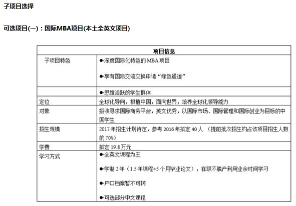 1. 招生類別分為兩個子項目:國際MBA項目(本土全英文)、在職MBA項目。兩個項目設(shè)置獨立的招生標準,分別招生,在簡歷評審、面試選拔等環(huán)節(jié)各自排序。申請任意子項目并獲得附條件錄取資格后,原則上不做任何項目調(diào)整。