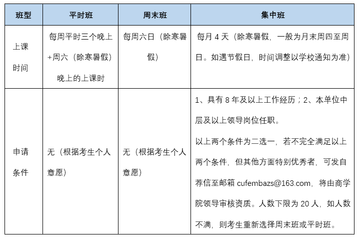 答:非全日制考生在提前批面試階段選擇的班型僅為初步意向??忌稍跀M錄取結(jié)果公示后,即2020年4月中下旬,在中財(cái)MBA招生系統(tǒng)中最終確認(rèn)班型。各班型上課時(shí)間及申請(qǐng)條件如下圖: