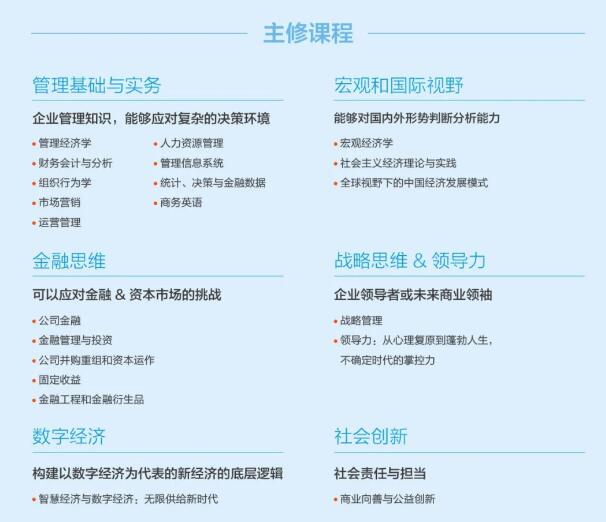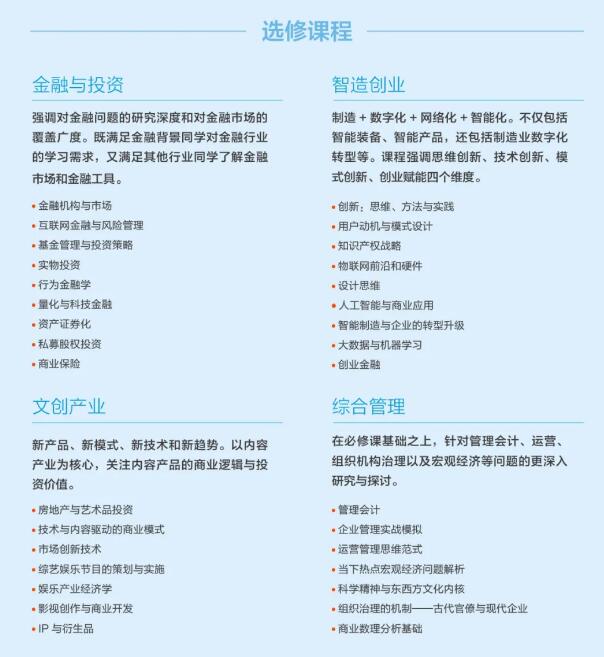 長江商學院MBA項目結合學院的差異化優(yōu)勢,在基礎核心課程之外,還圍繞金融與投資、智造創(chuàng)業(yè)、文創(chuàng)產(chǎn)業(yè)三個最具潛力的賽道以及綜合管理方向, 開設了豐富的選修課程,并通過多樣的行業(yè)實踐課程使同學保持對行業(yè)前沿趨勢的敏銳度,通過特色的海外課程提高同學的視野、實現(xiàn)資源跨界整合, 用多元的行業(yè) 講座和實景案例課堂給學生提供更充實的學習體驗。