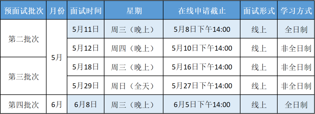 大家好!感謝您申請2023年入學華東師范大學MBA項目預面試。現(xiàn)階段因處于疫情防控階段,為方便考生,暫定全日制與非全日制預面試均采用線上形式(具體以郵件通知為準)。5月11日(全日制)預面試現(xiàn)因人數(shù)已滿,報名通道已提前自動關(guān)閉。現(xiàn)已開啟5月12日、5月18日(非全日制)和6月8日(全日制)預面試報名通道(具體詳見下圖,我們會根據(jù)實際情況逐步開放后期批次),因每一批次名額有限,人滿系統(tǒng)將提前自動關(guān)閉報名通道。預面試時間持續(xù)更新中,請隨時關(guān)注官方微信公眾號與官方網(wǎng)站。面試需注意事項將于面試前一周內(nèi)以官方郵件形式發(fā)送至各位考生申請時預留郵箱,請注意查收。