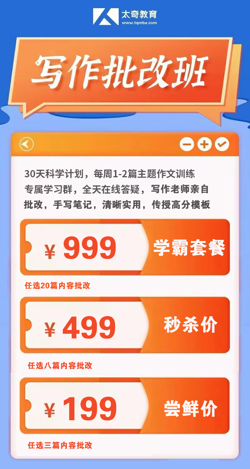 太奇寫作批改班也同步上線,為考生最大化模考收益,特聘請(qǐng)多位專業(yè)寫作老師判卷,1V1精講,需要的同學(xué)請(qǐng)咨詢太奇老師